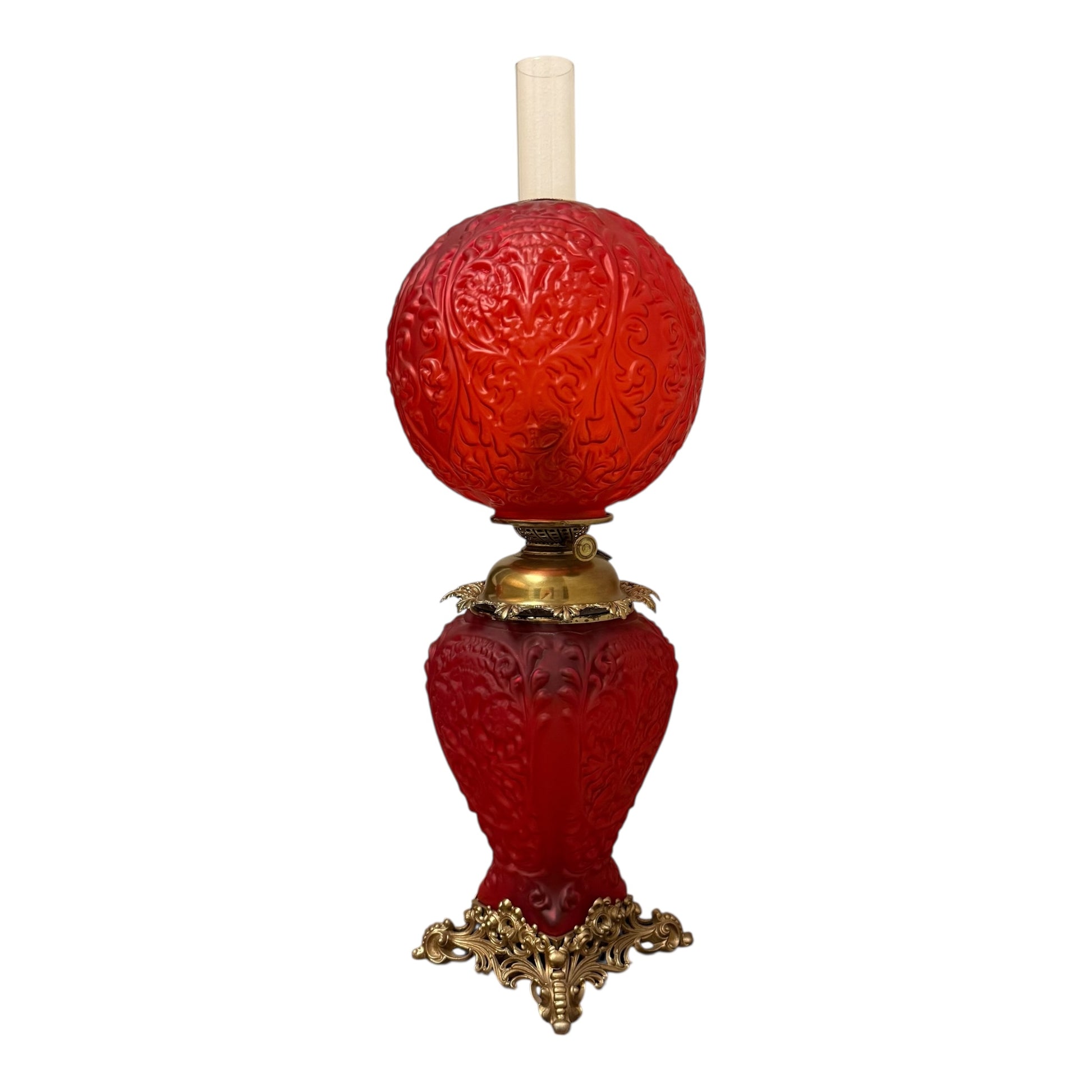 As an authentic antique produced in the late 19th to early 20th century, this lamp may exhibit minor characteristics inherent to period glassmaking, including small air bubbles, light manufacturing marks, or minor fitter chips consistent with original production methods and age. These characteristics are typical of period glass and do not detract from the lamp’s overall integrity, authenticity, or desirability.